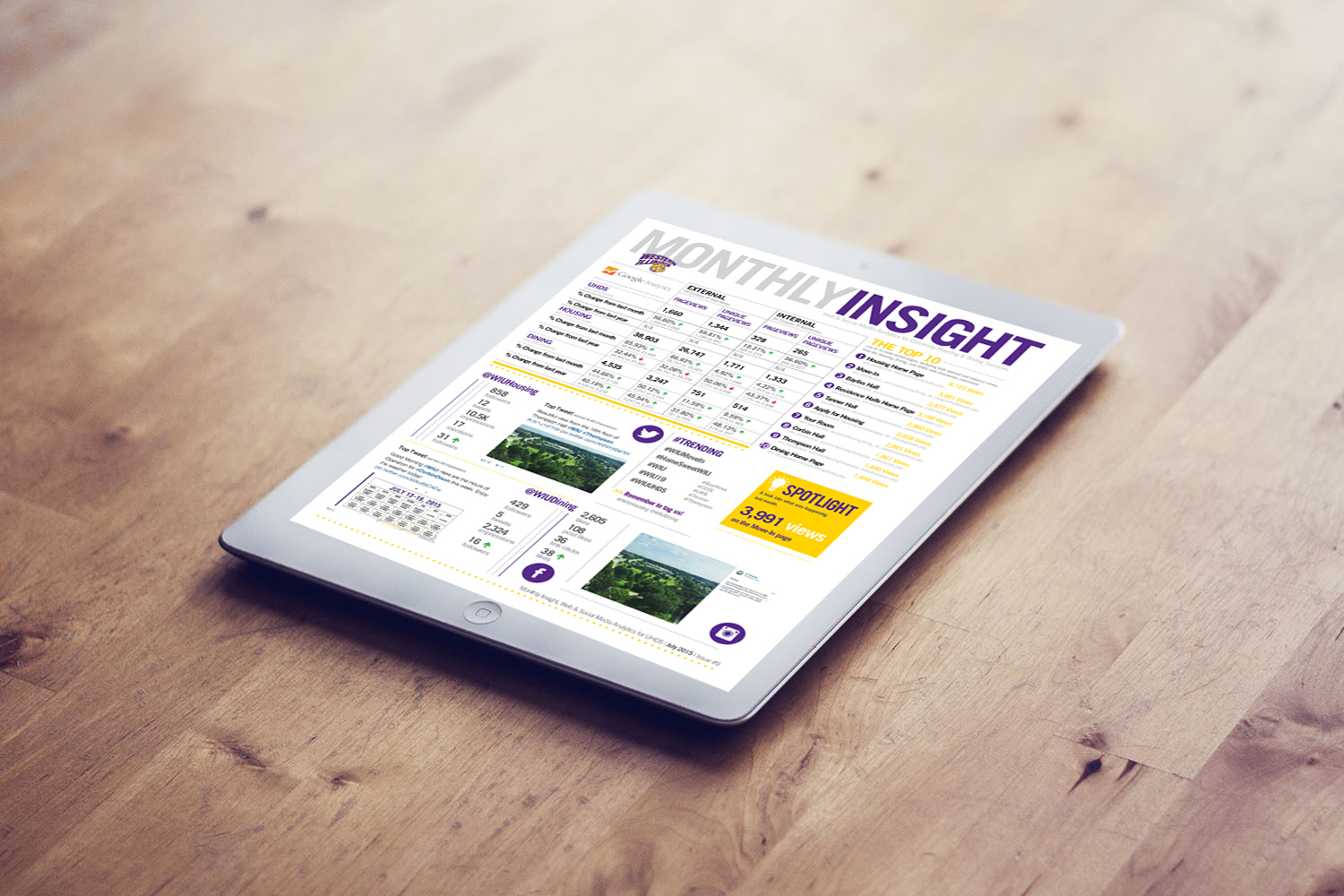 Monthly newsletter sent to University Housing & Dining Services staff with web and social media analytics. This was originally created as a PDF and delivered by email, and then later changed to an HTML email sent through Mailchimp.