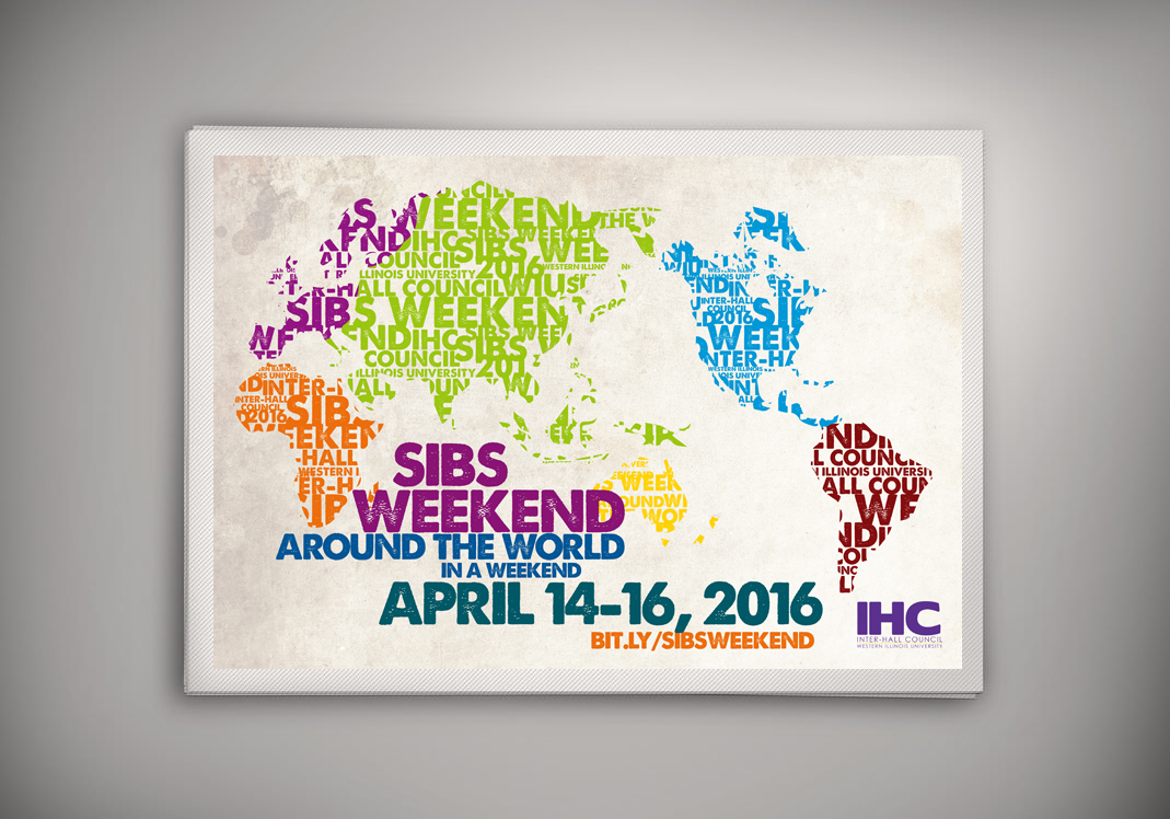 Sibs Weekend is an event hosted by the Inter-Hall Council, the student governing group within the residence halls. The theme of the 2016 event was “Around the World in a Weekend”. The design was used as a shirt image, which was made available for purchase, as well as shared on social media and on digital displays.